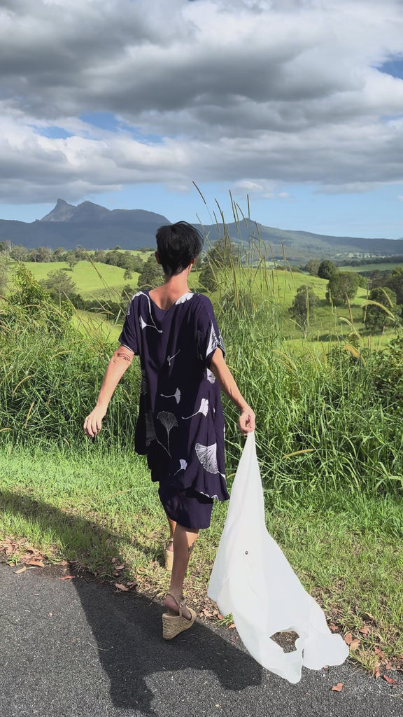 Ethically & slowly made in very small batches using a digital print method that ensures no waste of fabric or dye. Every dress is unique with the Gingko leaf print placement being slightly different on each one.